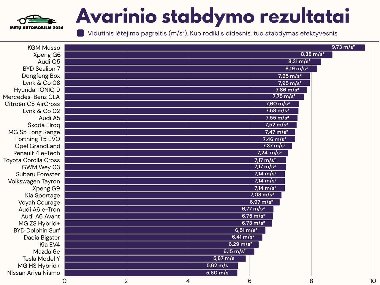 Absoliučiu lyderiu tapo elektrinis pikapas „KGM Musso“, pasiekęs vidutinį 9,73 m/s² lėtėjimo pagreitį stabdant nuo 80 km/h iki visiško sustojimo – tai beveik 1 g lėtėjimo jėga, arba laisvojo kritimo pagreitis (9,81 m/s²). Į geriausiųjų trejetą taip pat pateko „Xpeng G6“ (8,38 m/s²) ir „Audi Q5“ (8,31 m/s²).