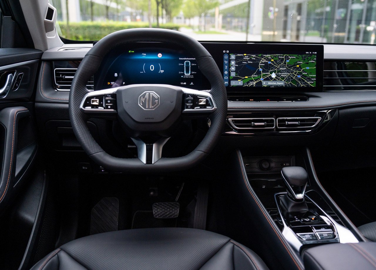 „MG HS Hybrid+“ salono aplinka yra visiškai skaitmenizuota. Joje dominuoja du identiško dydžio, 12,3 colio aukštos raiškos ekranai – vienas centre, kitas priešais vairuotoją.