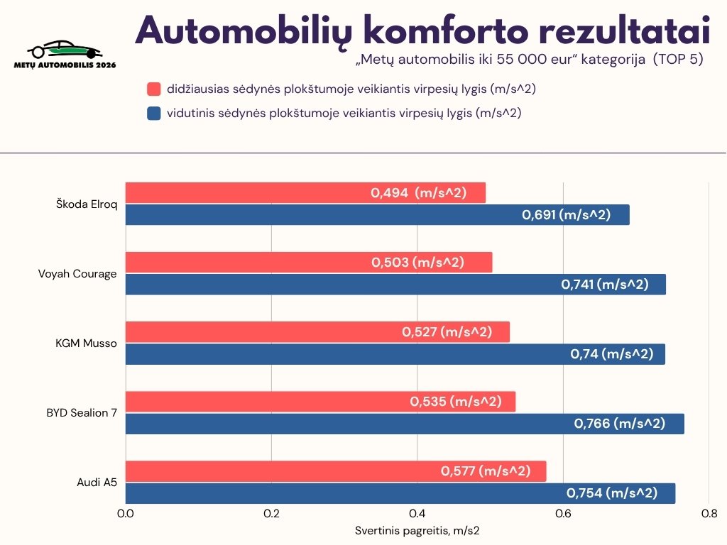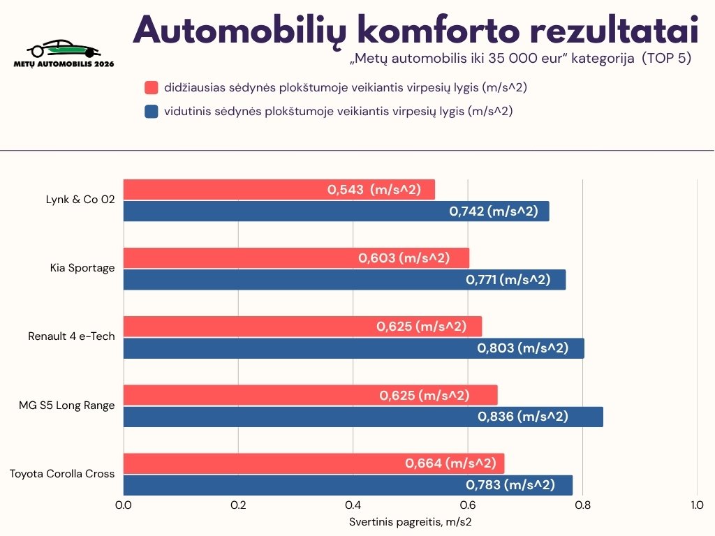 Biudžetinėje klasėje (automobiliai iki 35 000 eurų) geriausią vibracijų slopinimo ir bendro komforto lygį pasiekė elektrinis „Lynk & Co 02“. Jis aplenkė antroje vietoje likusį atnaujintą „Kia Sportage“, o trečiąją poziciją užėmė dar vienas elektromobilis – „Renault 4 E-Tech“.