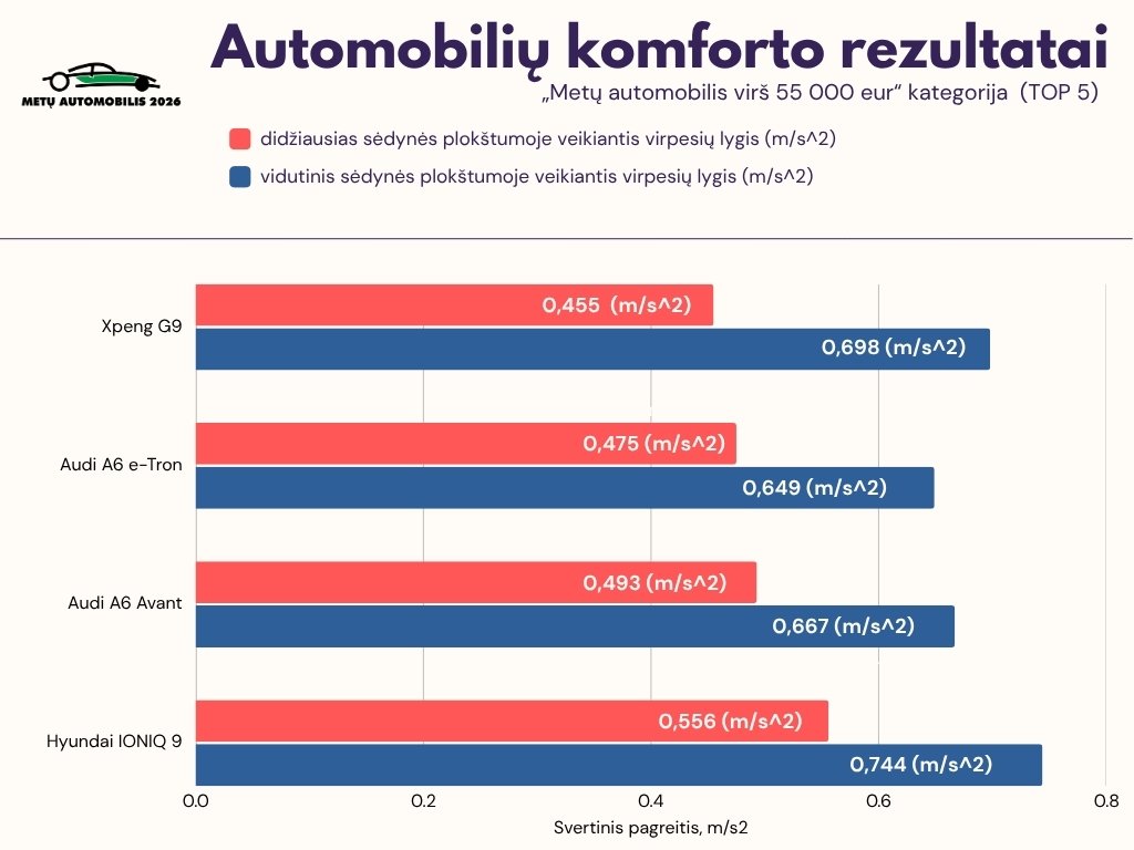 Susumavus visus specializuotų bandymų rezultatus, paaiškėjo ir absoliutus šių metų konkurso komforto lyderis. Juo tapo didelis elektrinis visureigis „Xpeng G9“, pasirodęs kiek geriau nei dyzelinis bei elektrinis „Audi A6“ modeliai.