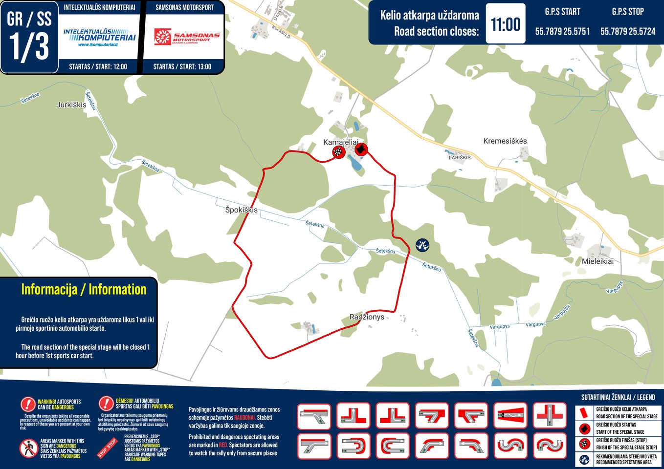 - GR/SS 1 – „Intelektualūs kompiuteriai“ ir GR/SS 3 – „Samsonas Motorsport“ (5,40 km)Šie ruožai startuoja ir finišuoja Kamajėlių kaime, apjuosdami Radžionių apylinkes.
