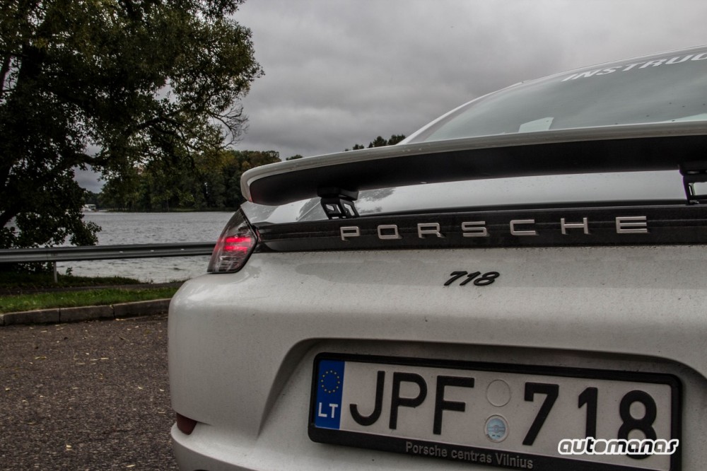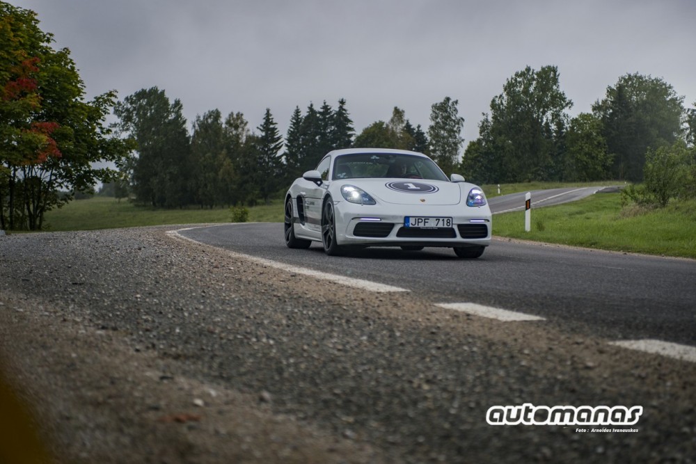 Tokie automobiliai kaip „718 Cayman S“ labiausiai mėgsta sausą, lygų asfaltą, ant kurio galėtų pademonstruoti visas savo galimybes. Deja, kuomet gavome galimybę išbandyti itin greitą ir pajėgų „718 Cayman S“, oro sąlygos keitėsi kas dešimt minučių. Vieną akimirką - pila kaip iš kibiro, sekančią akimirką - pro niūrius debesis išlenda saulė ir pradeda šildyti „718 Cayman S“ skruostus. Iš dalies tokios sąlygos leidžia suprasti, ar galiniais ratais varomas „Cayman S“ labai jautriai reaguoja į oro sąlygų pasikeitimus.