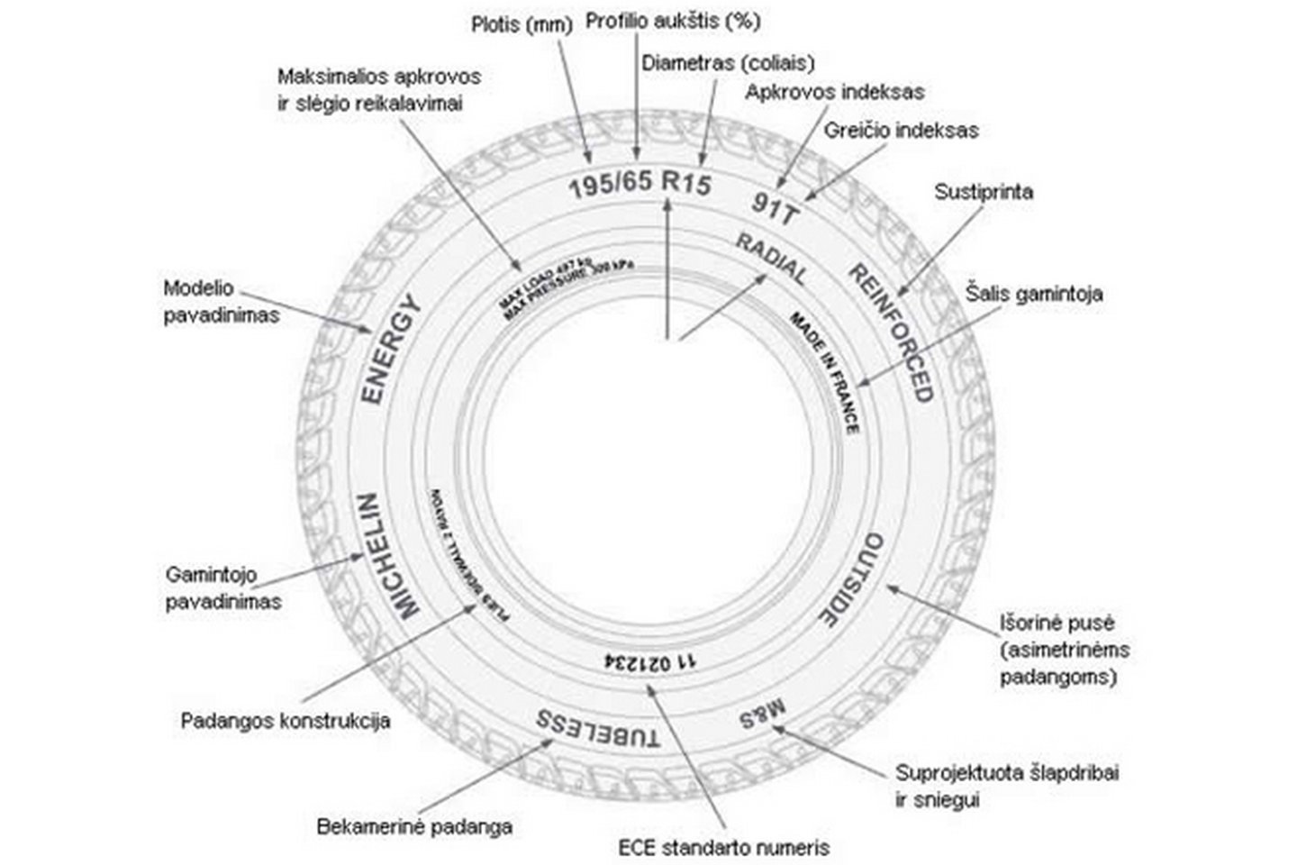 Matmenys (pvz., 165/65 R13): Plotis (mm) / Aukščio ir pločio santykis (%) / Konstrukcija (R - radialinė) / Ratlankio skersmuo (coliais).