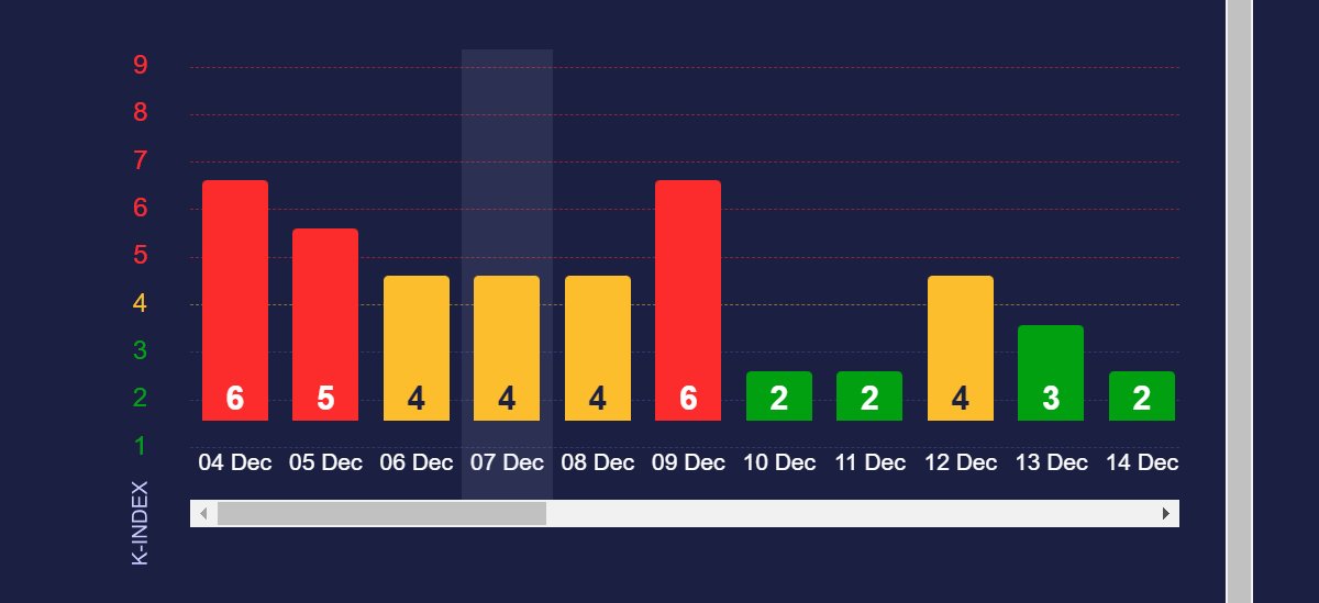Meteoagent.com prognozės rodo, kad šeštadienį, gruodžio 9 dieną, magnetinio lauko aktyvumas sustiprės iki šešių balų. Šiandien ir rytoj magnetinio lauko aktyvumas sieks keturis balus.