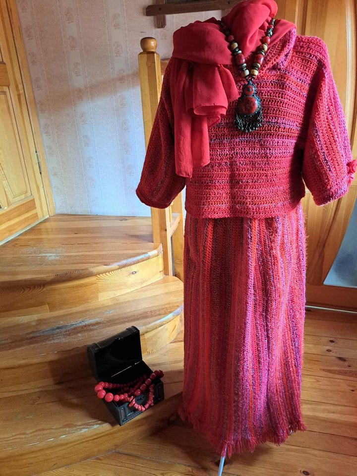 „Kai reikia suknelės, paprastai mezgu ją vientisą, be siūlių – tiek sijoną, tiek viršutinę dalį. Dažniausiai naudoju siūlus, kad nebūtų jokių susiuvimų, nes tai labai sudėtinga techniškai, o svarbiausia, kad darbas atrodytų gražiai ir tvarkingai. Mano kūriniai paprastai yra paprasti, jų grožis slypi spalvose, o ne sudėtinguose raštuose“, – sako pašnekovė.