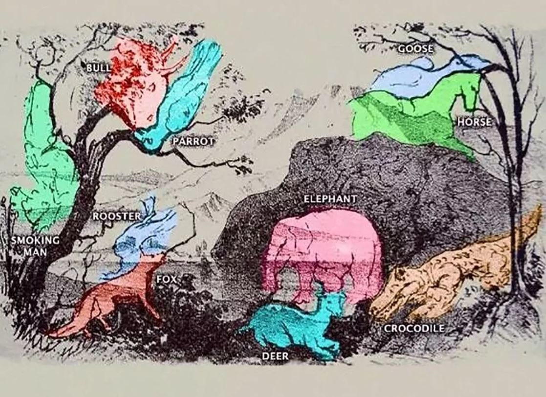 Iš pirmo žvilgsnio paveikslėlis atrodo kaip keistokas peizažas su medžiais, uola ir keliais krūmais, tačiau įsižiūrėję atidžiau, pamatysite daugybę gyvūnų, rašo mirror.co.uk.