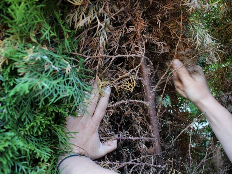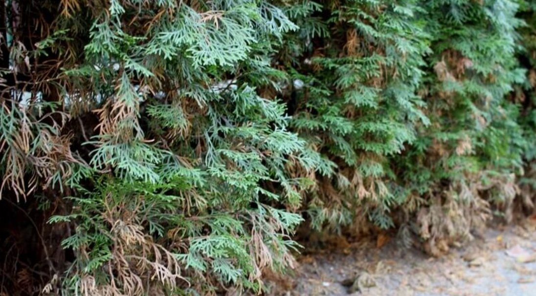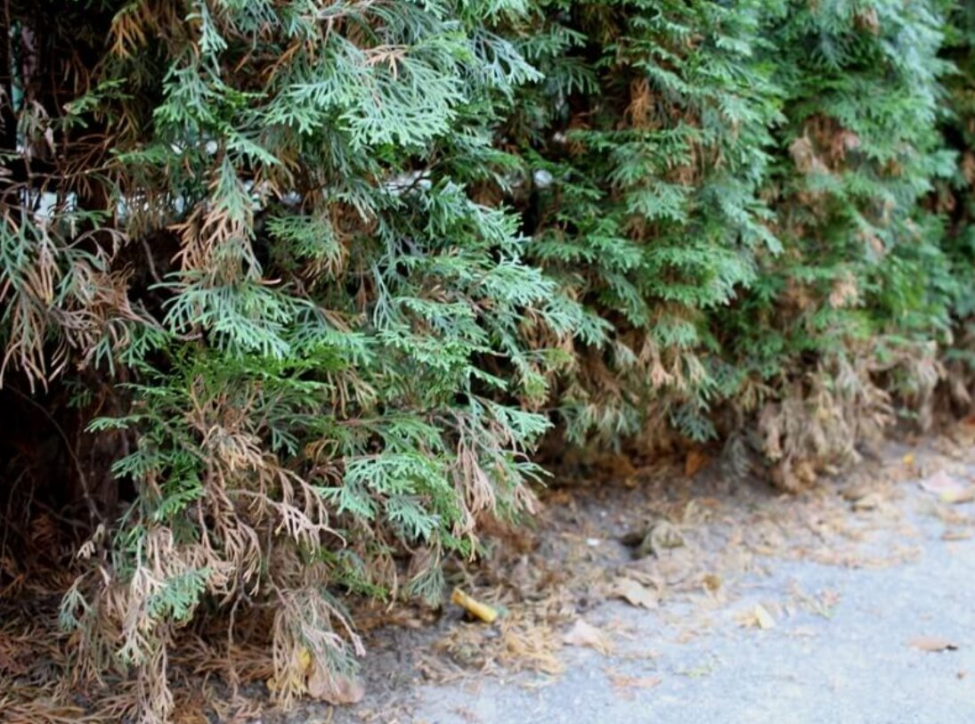 Tokia tujų gyvatvorė atrodo sveika, žalia, puošni, turi didelį prieaugį, tačiau ją praskleidę galite rasti daug rudų nudžiuvusių šakelių. Nupurtę rudus spygliukus pamatysite jaunus naujų šakelių ūgliukus.