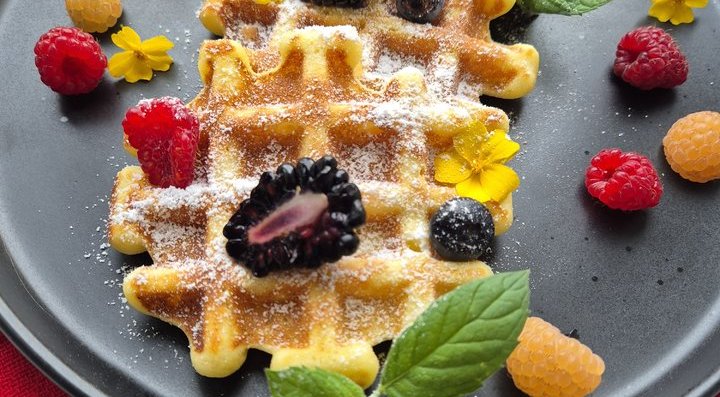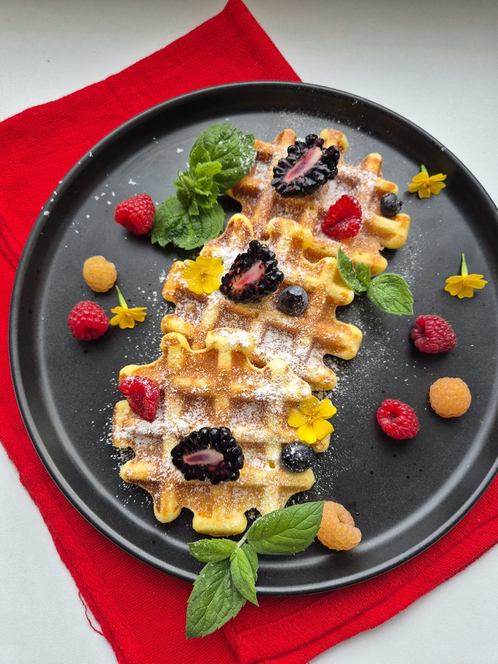 Iš normos iškepiau 8 vaflius. Reikės: 2 kiaušiniai; 2 v. š. cukraus; 2 v. š. rikotos; 50 g sviesto tirpinto; 200 ml miltų; 1 a. š. kepimo miltelių; uogų, patiekti; cukraus pudros, pabarstyti, jei norisi.