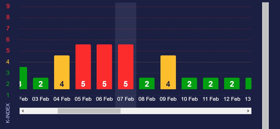Tokia pati situacija buvo ir vakar, vasario 6 dieną, bei užvakar, vasario 5 dieną. Tomis dienomis magnetinės audros taip pat įvertintos net penkiais balais.