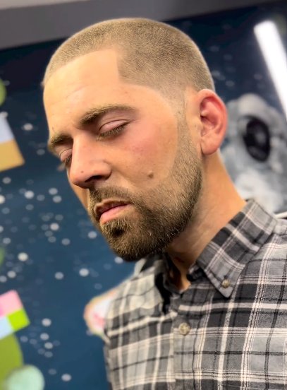Kirpėjas su kirpimo mašinėle patrumpina jo barzdą, nukerpa plaukus ir suteikia vadinamąjį „buzz cut“.