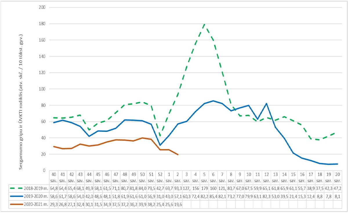 Praėjusio gripo sezono (2019–2020 m.) antrą savaitę bendras sergamumo rodiklis buvo didesnis (57,1 atvejo 10 tūkst. gyventojų).
