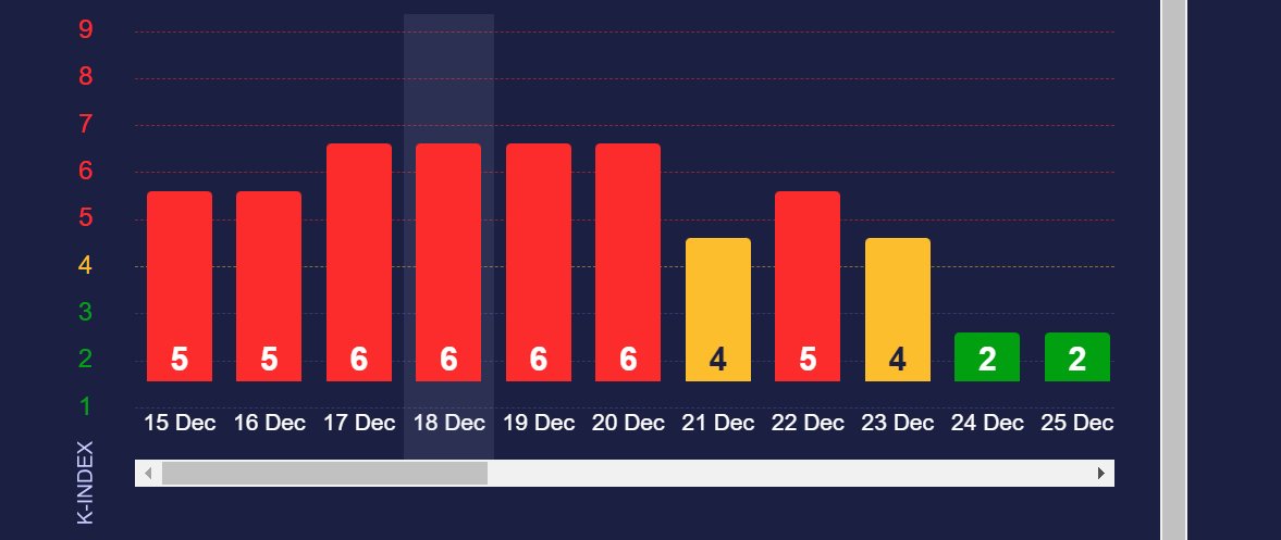 Meteoagent.com praneša, kad šiandien magnetinio lauko aktyvumas siekia šešis balus, o tai yra aukšti skaičiai, kurie rodo, kad magnetinė audra itin stipri. Rytoj, gruodžio 21-ąją dieną, galima laukti ne tokios stiprios magnetinės audros. Ji bus keturių balų.