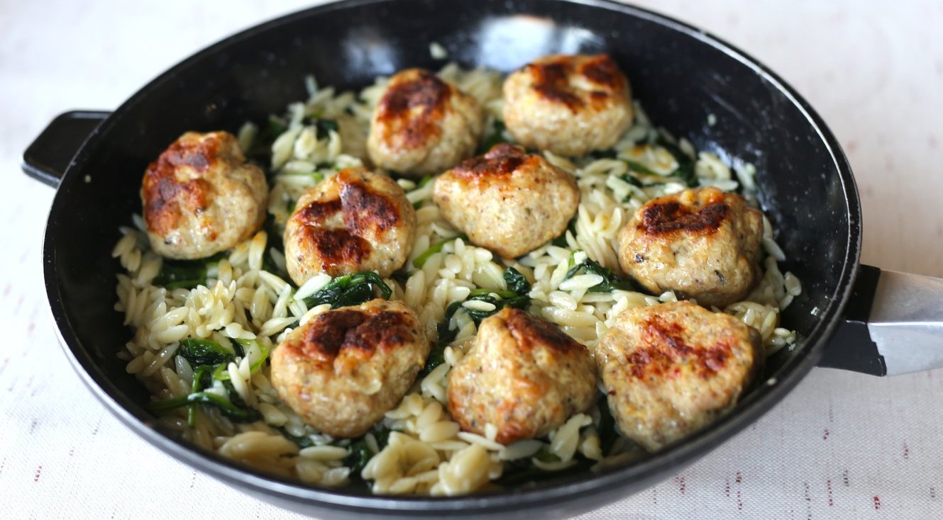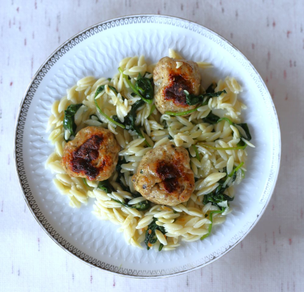 Citrininių paukštienos kukulių su rikota ir orzo makaronais bei česnakiniu špinatų padažu receptas