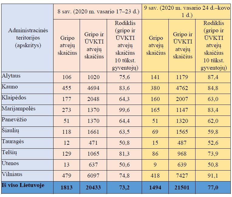 Bendras sergamumo gripu ir ŪVKTI rodiklis Lietuvoje vasario 24 d.–kovo 1 d. siekė 77,0 atvejo 10 tūkst. gyventojų (ankstesniąją savaitę – 73,2 atvejo 10 tūkst. gyventojų). Praėjusią savaitę daugiausiai sergančiųjų užregistruota Vilniaus apskrityje, mažiausiai – Utenos apskrityje.