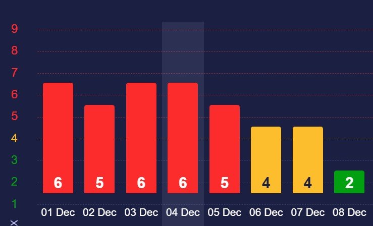 Prognozuojama, kad gruodžio 6-ąją aktyvumas nurims, sieks keturis balus. Toks aktyvumo lygis išsilaikys ir gruodžio 7 dieną.