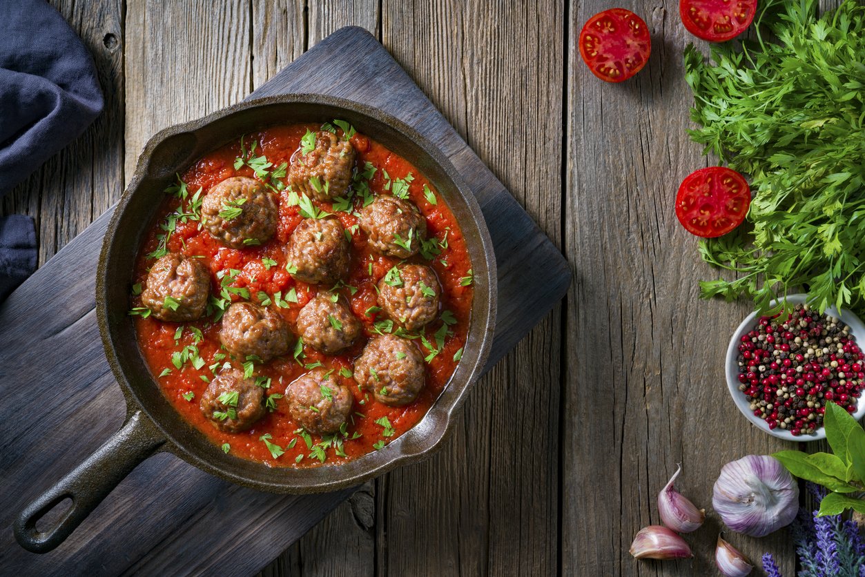 Reikės: 500 g smulkintos mėsos arba faršo, 400 g konservuotų smulkintų pomidorų, 1 didelio svogūno, 2 skiltelių česnako, pusės stiklinės maltų džiūvėsėlių, 1 kiaušinio, druskos pipirų, mėsos prieskonių.