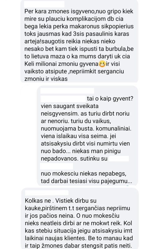 Kita jai antrino: „Toks jausmas, kad pasaulio pabaiga. Kaip dirbom, taip ir dirbam. Pasibaigs „karantinas“ ir visi pamirš“.