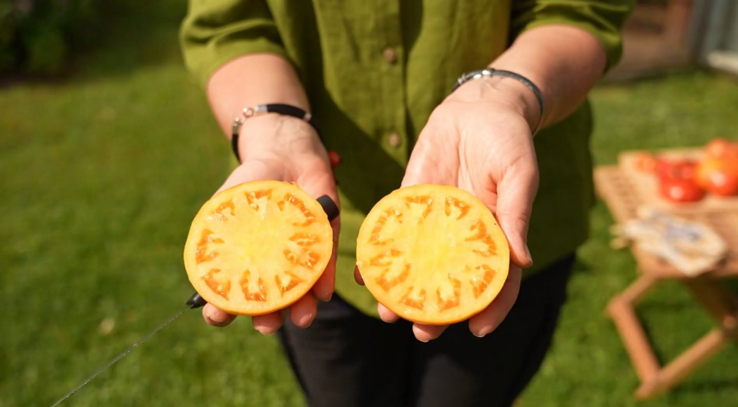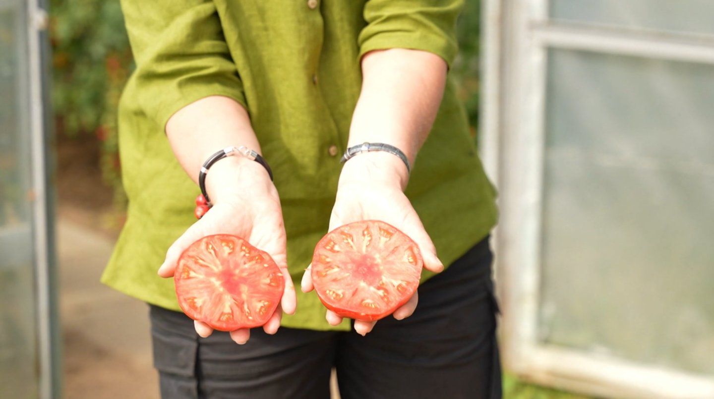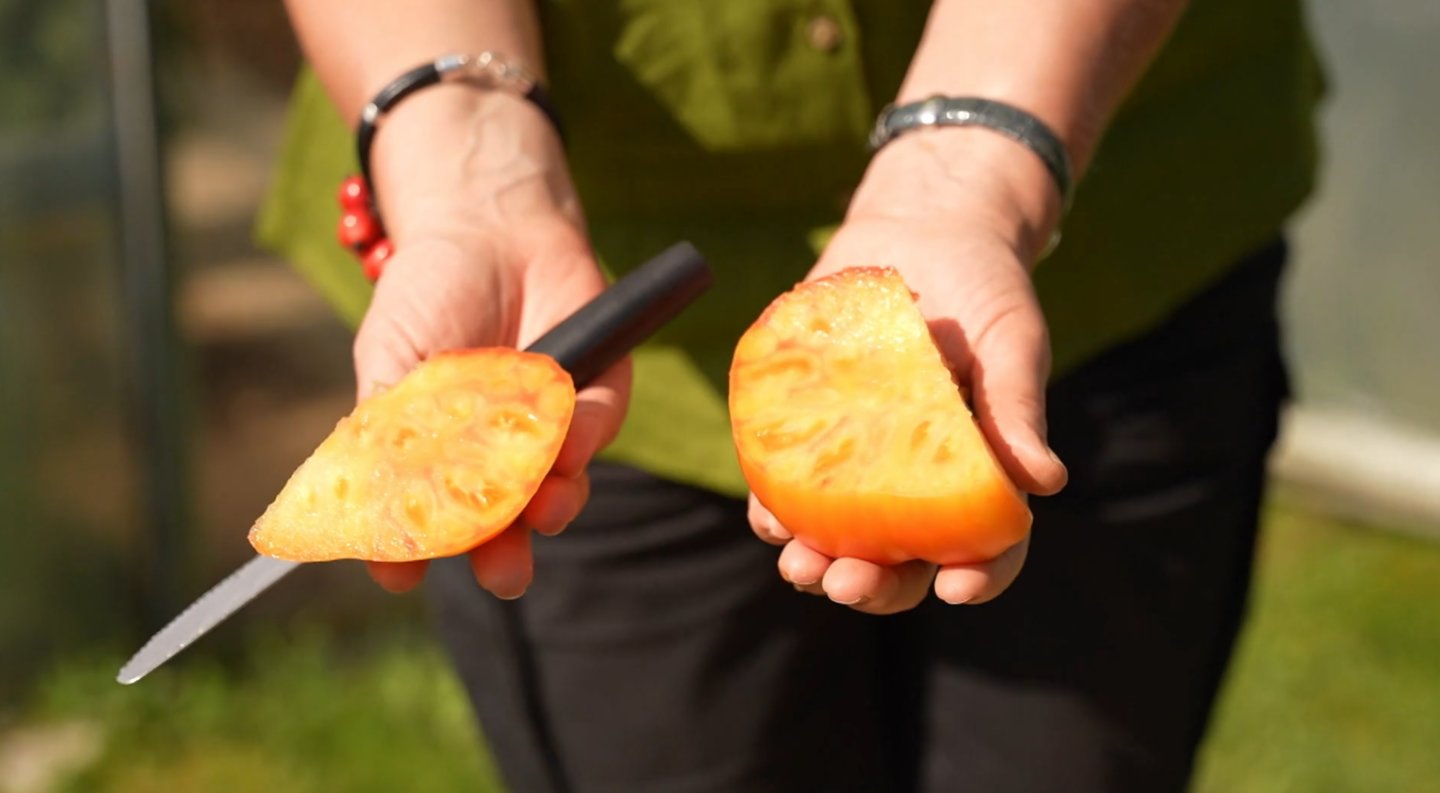 „Bet vis tiek tai yra puiki raudonos spalvos pomidorų veislė, labai skanūs vaisiai. Štai toks pomidoras – nedaug sėklų, labai daug masės“, – pasakojo laidos konsultantė.