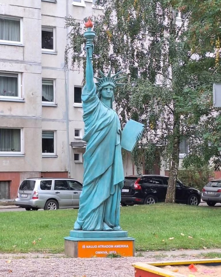 Nuotraukoje matome, kad Šeškinės rajone stovi mažesnė amerikietiškos Laisvės statulos versija. Žemiau puikuojasi užrašas: „Iš naujo atradom Ameriką”. Už viso to stovi… „Omniva”.