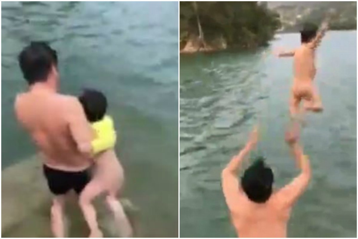 Iš pradžių tėvas sūnui dar leido apsiprasti su šaltu telkinio vandeniu – čia murkdė jo beveik visiškai nurengtą kūnelį. Aplink girdėjosi linksmi tarsi idėjai pritariantys šūksniai, tad netrukus tėvas ištiesė rankas ir išmetė mažylį į orą. Šis klykdamas įsmigo į vandenį.