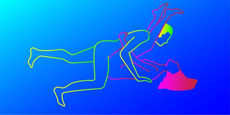 Moteris atsigula ant pilvo, šiek tiek kilsteli sėdmenis, kad vyrui būtų patogiau įeiti. Vyras atsigula ant jos pasiremdamas rankomis.