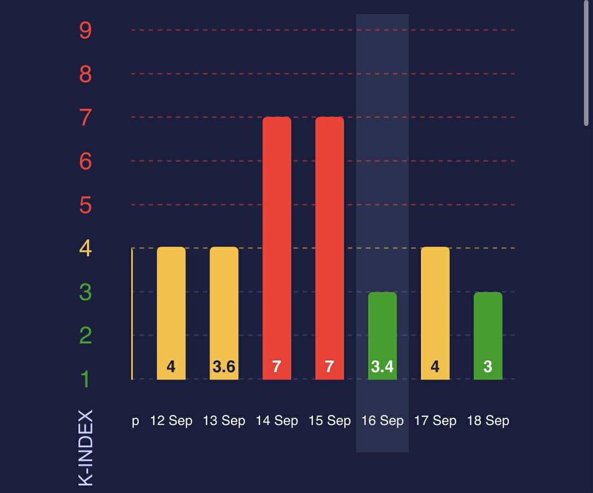 Rytoj, rugsėjo 17-ąją, aktyvumas kiek padidės ir šoktels iki 4 balų, o tai traktuojama kaip nedidelė geomagnetinė audra.