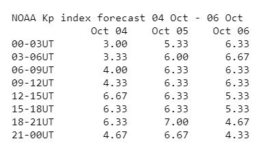 Jungtinių Amerikos Valstijų Nacionalinės vandenynų ir atmosferos tyrimų administracijos pateikiamoje artimiausių trijų dienų prognozėje matyti, kad šiandieną aktyvums pasieks netoli 7 balų – daugiausia 6,67, tačiau jau tik popiet. Vakarėjant aktyvumas sieks 6,33, vėliau nukris iki 4,67, o jau rytojaus rytą ims pamažu kilti nuo 5,33 iki pat 7 balų.