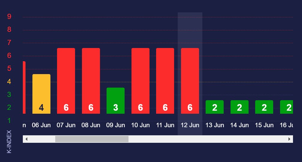 Magnetinių audrų prognozę pateikę meteoagent.com skelbia, kad birželio 12 dieną, magnetinio lauko aktyvumas sieks šešis balus. O rytoj, birželio 13 dieną, magnetinio lauko aktyvumas sumažės iki dviejų balų.