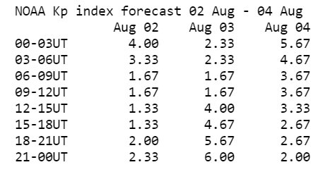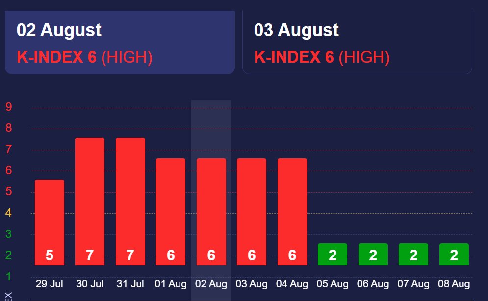 Meteoagent.com duomenimis, šiandieninė magnetinė audra bus 6 balų stiprumo. Rugpjūčio 3 ir 4 dienomis taip pat prognozuojama 6 balų stiprumo magnetinė audra, o sumažėti iki 2 balų turėtų rugpjūčio 5 dieną, pirmadienį.