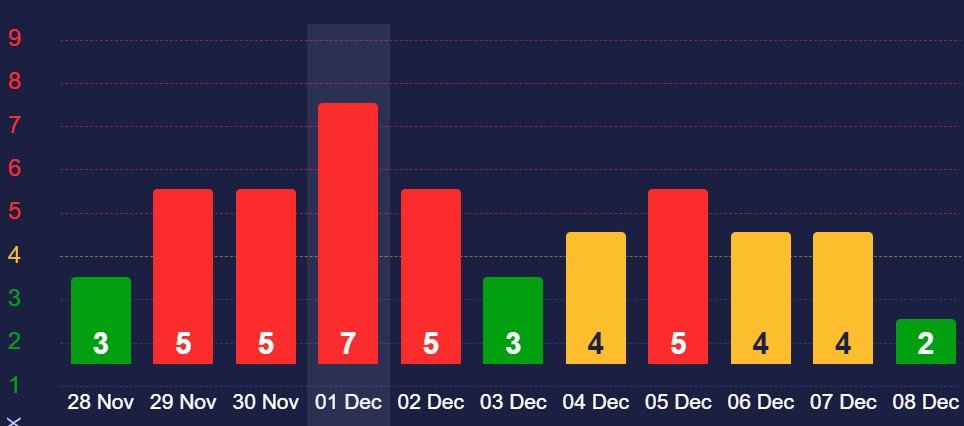 Rytoj, gruodžio antrąją, magnetinė audra bus ne tokia intensyvi, magnetinio lauko aktyvumas sieks penkis balus. Vėliau viskas nurims, tačiau gruodžio 4-ąją prognozuojamas suaktyvėjimas iki keturių balų.