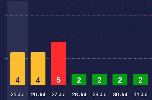 Vis tik šeštadienį, liepos 27-ąją, magnetinio lauko aktyvumas padidės ir pakils iki penkių balų. Tai laikoma riba, kai magnetinių audrų poveikis tampa stipresnis ir gali paveikti jautresnius asmenis, o kuo arčiau devynių balų priartėjama, tuo didesnė tikimybė, kad poveikį pajus net sveiki žmonės.