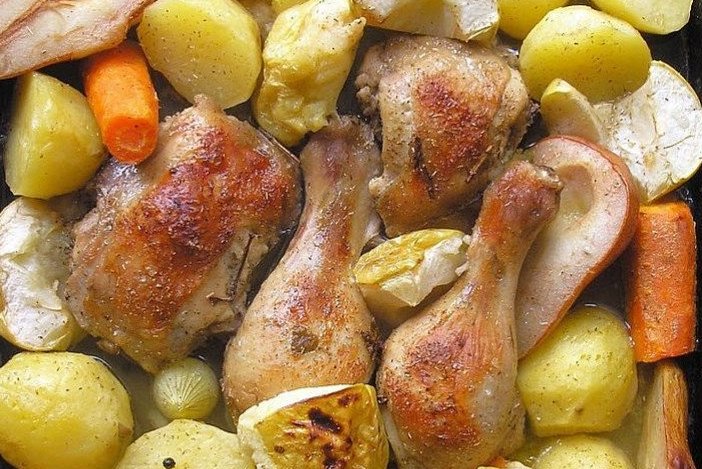 Jums reikės: 2 vištienos ketvirčių, 3 valgomųjų šaukštų citrinos sulčių, džiovintų čiobrelių, raudonėlių, peletrūno, pusės šaukštelio maltų juodųjų pipirų, 2 kriaušių, 2 obuolių, 1 morkos, svogūno, 2 lauro lapelių, 6-8 bulvių, 4-5 juodųjų ir kvapiųjų pipirų žirnelių, druskos, pusės stiklinės vandens.