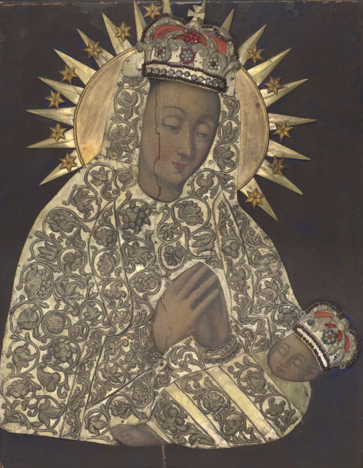Drobės tokiu pavadinimu mes neradome, tačiau dėmesį patraukė vienuolyno kapitulos salėje, kur įsirengėme „fotostudiją“, kabėjęs Marijos atvaizdas su aptaisais juodame fone.