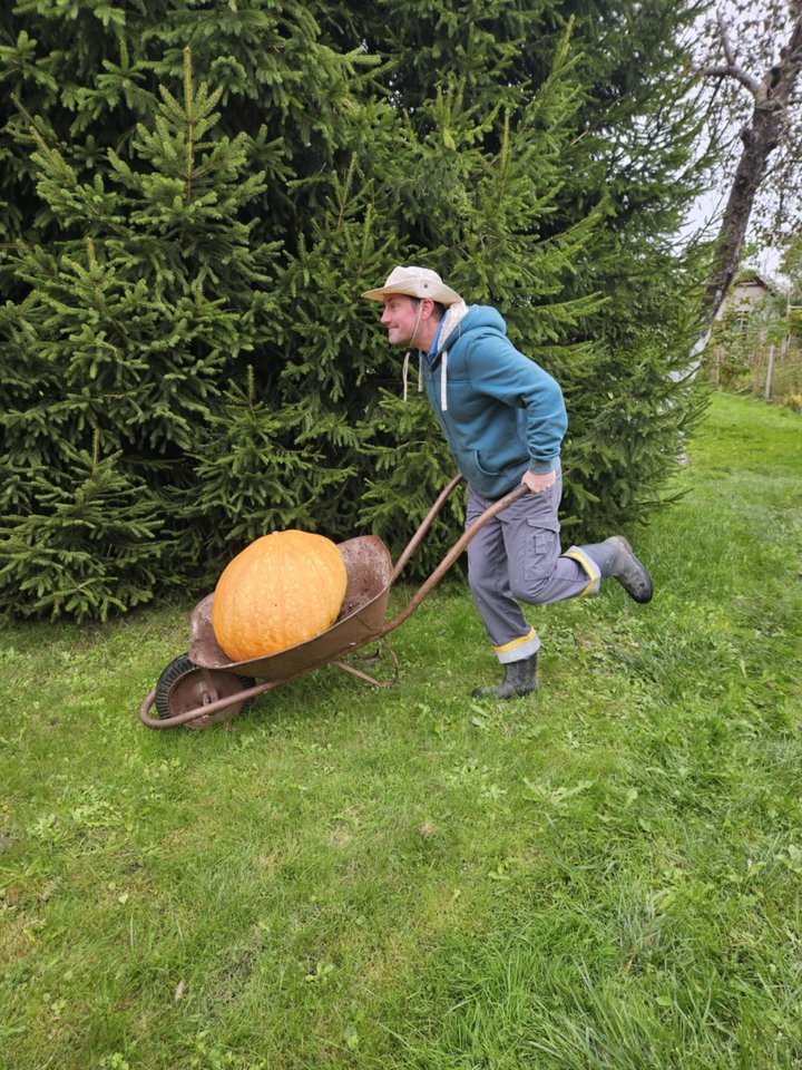 Pasak sodininko, didįjį moliūgą iš lysvės teko transportuoti karučiu:
