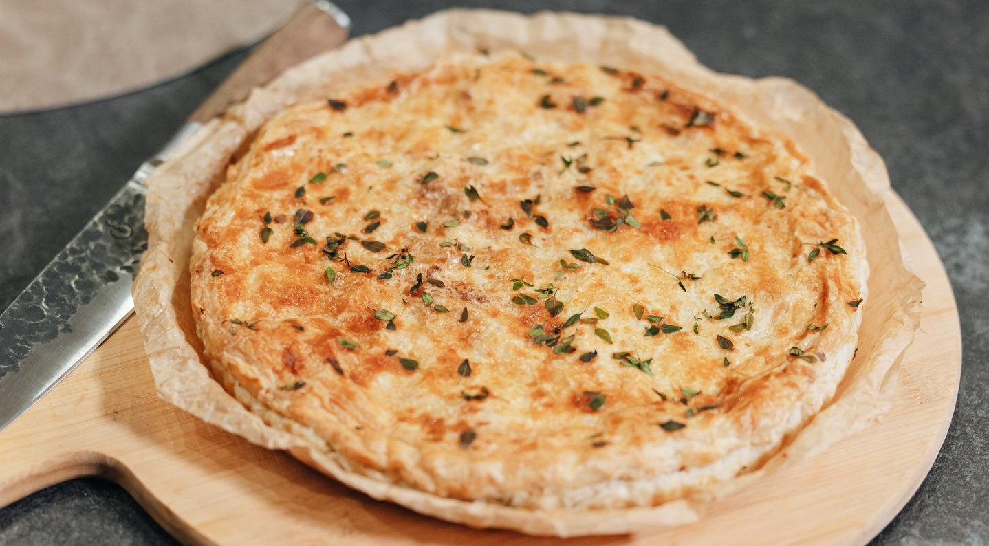 Galiausiai, iškočiokite tešlą. Kepimo indą išklokite šiek tiek daugiau nei puse tešlos, sudėkite įdarą, uždenkite likusia tešlos dalimi ir sutvirtinkite kraštus. Viršų patepkite kiaušinio plakiniu, šakute subadykite tešlą, pabarstykite čiobreliu. Kepkite 200 laipsnių įkaitintoje orkaitėje apie 30 minučių, kol pyragas taps auksinės spalvos.