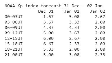 Prognozuojama, kad rytoj aktyvumas vis dar bus padidėjęs, tačiau ne taip stipriai – prognozės rodo, kad pirmoji 2025 metų diena praeis aukščiausiai pasiekus penkis balus, o jau iškart po to sumažės ir nukris iki trijų balų.