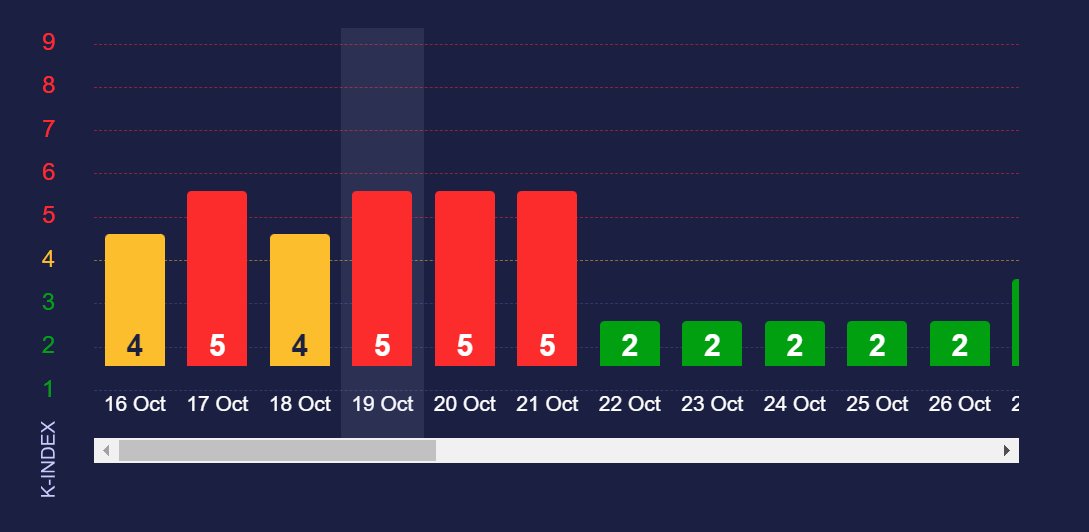 Prognozuojama, kad penkių balų stiprumo magnetinio lauko aktyvumas išsilaikys tris dienas, nuo spalio 19 iki 21 dienos.