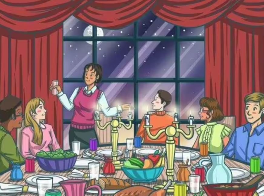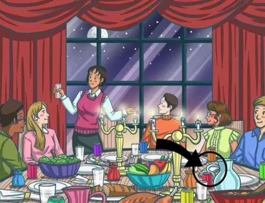 Šiame paveikslėlyje pavaizduota vakarieniauti susirinkusi šeima, tačiau kažkur čia paslėpta viena balta pirštinė.