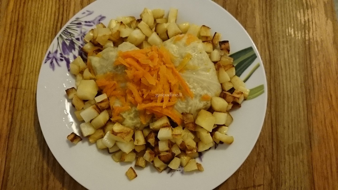 Troškinti balandėliai su morkomis ir keptais pastarnokais. Lengvas skanus maistas.