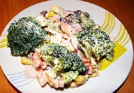 Viename dubenyje sumaišomi brokoliai, sūris, paprika, kumpis, kukurūzai ir pupelės.