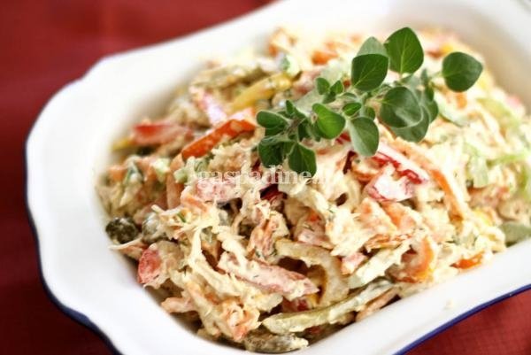 Vištienos krūtinėlę išvirti (vėliau sultinuką panaudojame sriubai), atvėsinti ir supjaustyti kubeliais arba suplėšyti šiaudeliais. Raudonąją papriką, agurkėlius ir pomidorus supjaustyti kubeliais arba juostelėmis (pagal pasirinkimą). Viską šiek tiek pasūdyti, pagardinti pipirais ir sumaišyti su majonezu. Mes šioms salotoms renkamės Hamker Remoulade majonązą - jis labiausiai tinka. Skanaus.