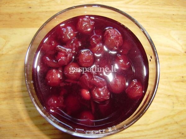 - Perrinktos vyšnios nuplaunamos ir nutraukomi koteliai. Iš pusės vyšnių išimami kauleliai, vyšnios sumalamos ir pro marlę išspaudžiamos sultys. 1 L sulčių ištirpinama 300 g cukraus ir pakaitinama iki 95° C. Likusioji pusė vyšnių su kauleliais sudedama į stiklainius, užpilama karštomis sultimis ir pasterizuojama 85° C temperatūroje 1 L talpos indai — 20 min. kaitinami kaitinamo vandens puode.