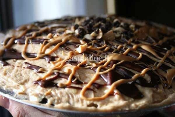 Sausainių trupinius sumaišyti su 0,25 stiklinės sviesto, paskleisti ant kepimo popieriumi išklotos kepimo skardos ir pakepinti apie 10 min. 180 laipsnių temperatūroje. Apkepinus, palikti atvėsti. Viename dubenyje, iki vientisos masės išmaišyti grietinėlės sūrį, 1 stiklinę žemės riešutų sviesto, cukrų, vanilę ir 1 šaukštą minkšto sviesto. Įmaišyti plaktą grietinėlę ir su 1 stiklinę pakepintų šokoladinių sausainių trupinių. Viską apšlakstyti tirpintu šokoladu bei tirpintu žemės riešutų sviestu ir apibarstyti kapotais žemės riešutais bei likusiais šokoladinių sausainių trupiniai. Pyragą gerai atšaldyti ir patiekti. Pasigardžiuokime!