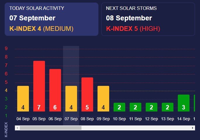 Meteoagent.com duomenimis, itin stipri magnetinė banga buvo jaučiama vakar, jos stiprumas siekė 6-7 balus. Šiandien magnetinės audros poveikis yra vertinamas kaip vidutinis, mat jos K-indeksas yra 4 balai.