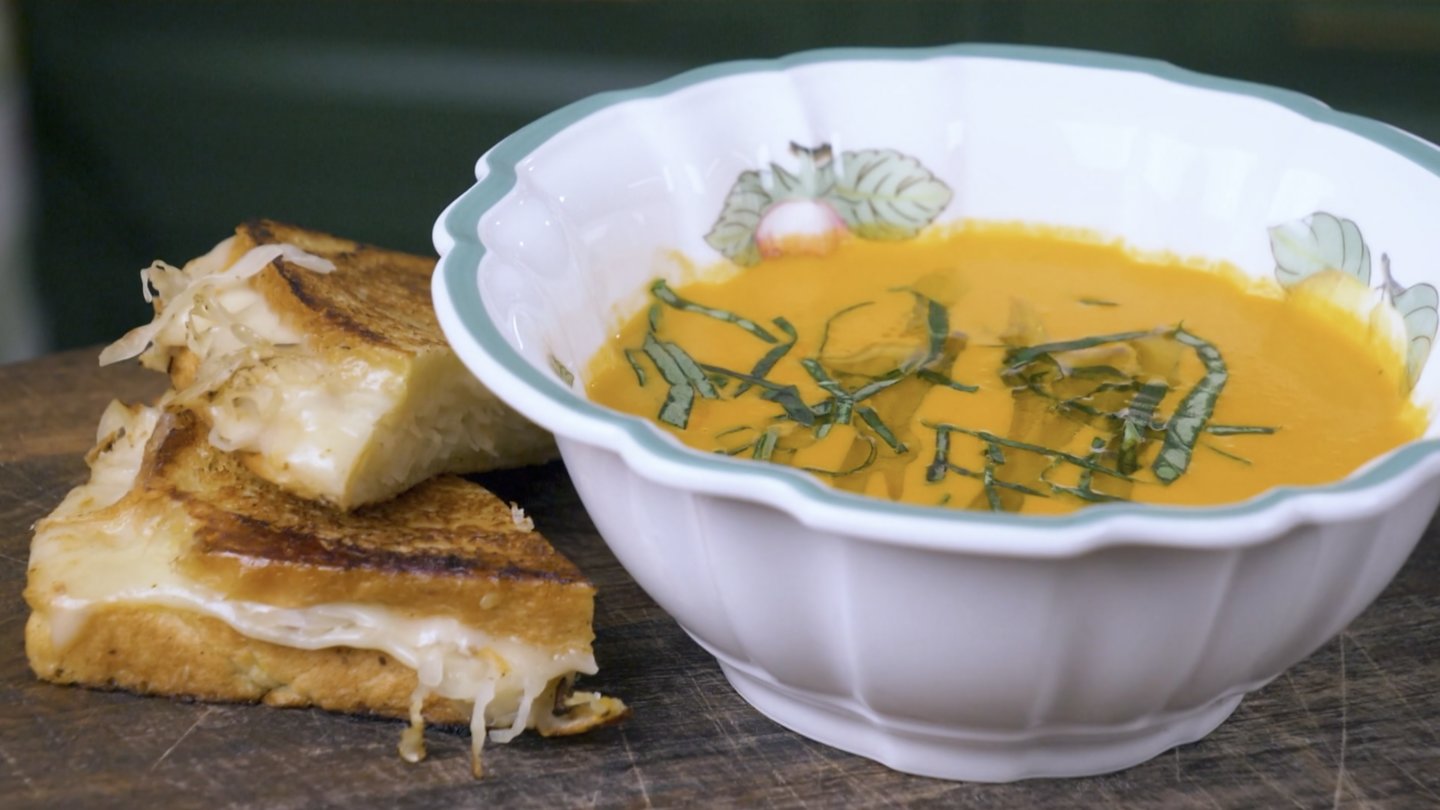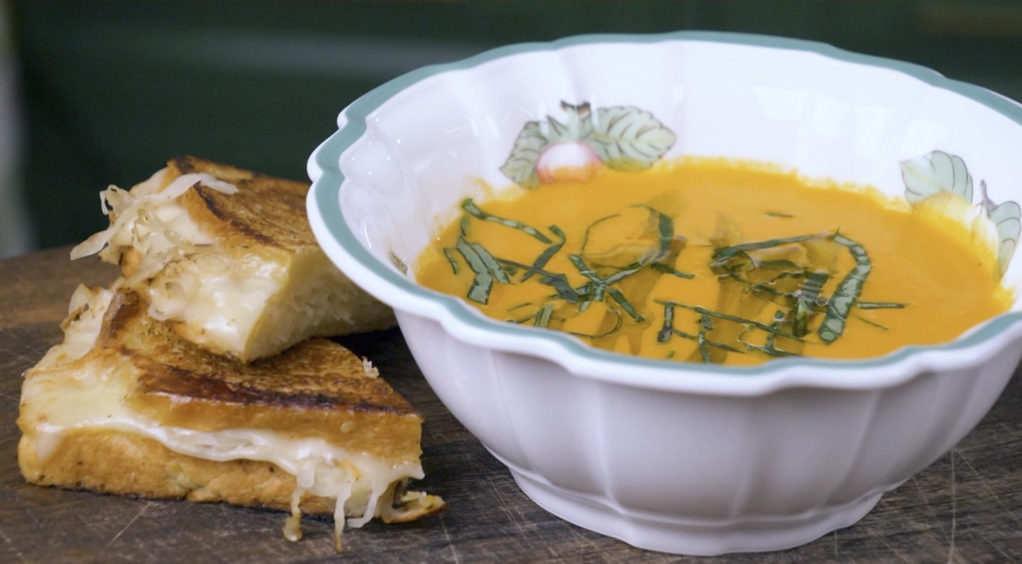 Įkaitinkite keptuvę, įpilkite šlakelį aliejaus ir apkepkite sumuštinį iš abiejų pusių. Patiekite, kol karštas, kartu su sriuba.