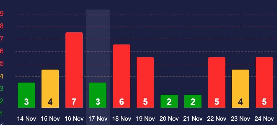 Prognozių duomenys rodo, kad po savaitgalio porą dienų galėsime atsikvėpti, tačiau kitą trečiadienį, lapkričio 22 dieną, magnetinio lauko aktyvumas vėl padidės iki penkių balų ir nors lapkričio 23-ąją sumažės iki keturių balų, kitą penktadienį vėl sieks penkis balus.