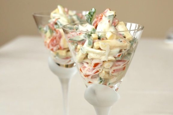 - majonezo arba aliejaus + truputį citrinos sulčių (gaminant su krabų lazdelėmis),