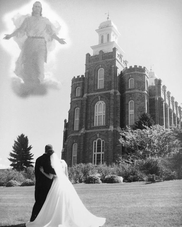 Moteris pasidalino juodai balta nuotrauka iš savo vestuvių, kurioje yra ji su sutuoktiniu Benu. Jaunavedžiai stovi į kamerą atsukę nugaras ir žvelgia į nuostabų vestuvių šventei skirtą pastatą. Tačiau nuotrauką gerai atidarius, pasirodo Jėzus.
