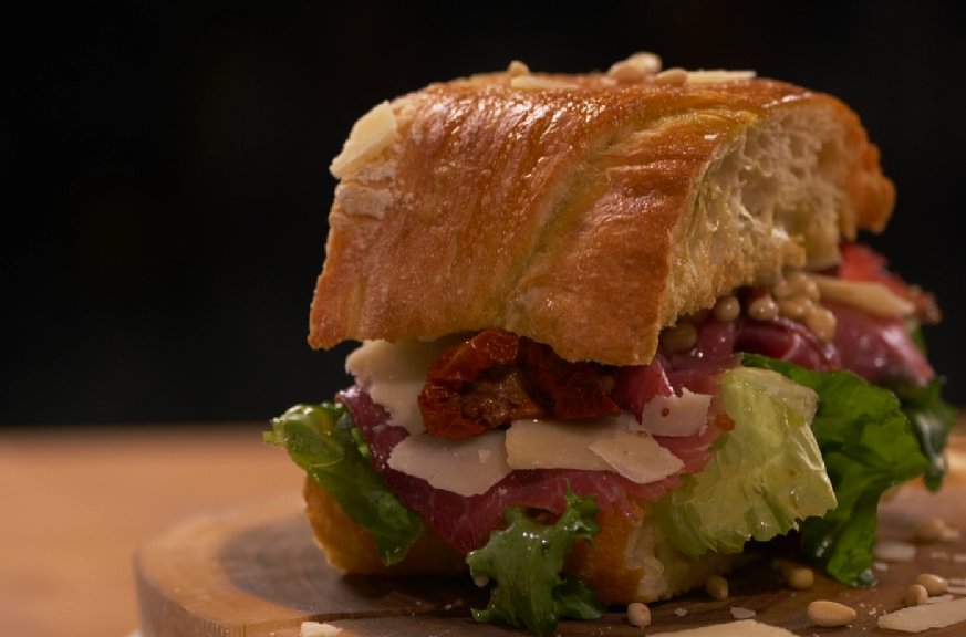Supjaustome saulėje džiovintus pomidorus. Į salotų mišinį įpilame alyvuogių aliejaus ir išmaišome. Ant apskrudusios apatinės ir viršutinės duonos dalies tepame padažą iš „Philadelphia“ sūrio ir trumų majonezo. Dedame salotų lapus ir jau pamarinuotus jautienos gabalėlius. Tada dedame saulėje džiovintus pomidorus ir parmezano sūrį. Uždarome sumuštinį su antru duonos gabalėliu ir pabarstome kedro riešutų ant viršaus.