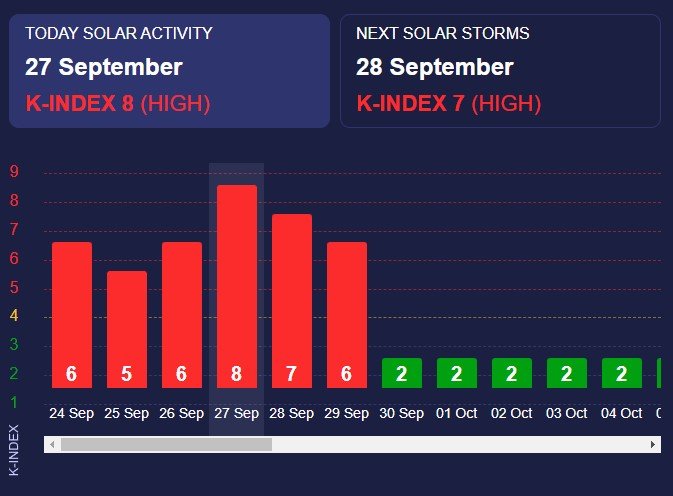 Meteoagent.com duomenimis, rugsėjo 27 dieną fiksuojamos magnetinės audros stiprumas siekia net 8 balus. Surinkti duomenys rodo, kad padidėjęs aktyvumas vyravo ir savaitės pradžioje.